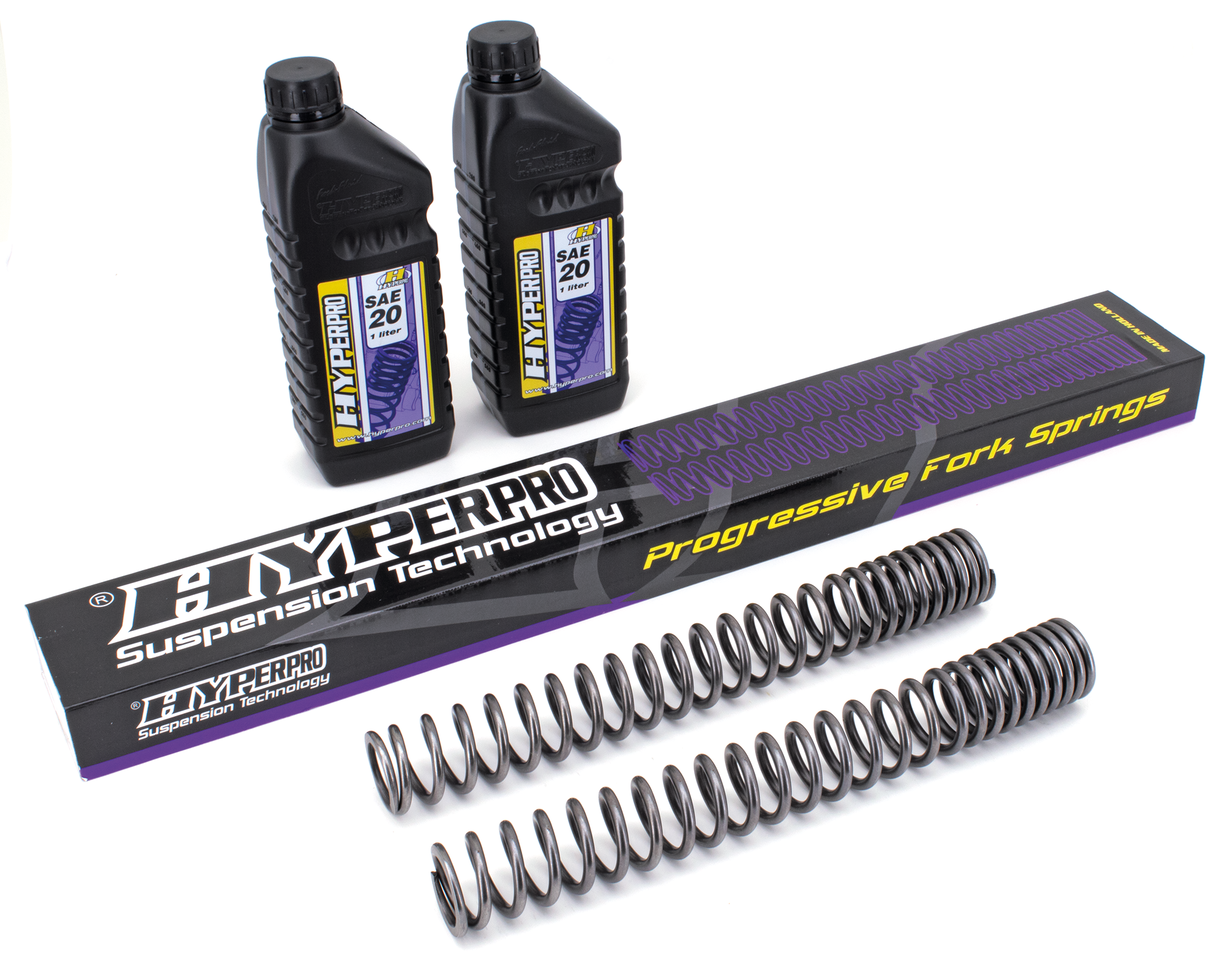 Hyperpro has put years of extensive Research & Development on front forks, shocks, springs and suspension systems. As most of the time a linear spring is either too hard or too soft at the beginning and/or at the end, a so called one-step progressive spring is an improvement, but is still a compromise between comfort and safety. The sudden change from soft to hard is often felt as a disadvantage and can lead to "speed wobbles". Hyperpro came up with the noncompromising solution: the "Link-System Curve Design" for springs. With this construction a spring can be designed to satisfy all the demands of modern motorcycle technology. Hyperpro gives you a sensitive initial part of the stroke with a smoothly increasing spring rate for safety and anti-dive at the end of the stroke. Together with the use of the highest quality materials and precision machining this results in the best springs that money can buy. The fork springs are manufactured to DIN-2095, class 1 and are specially polished for minimal friction and carry a lifetime warranty against breaking. Front fork kits come complete with springs, one liter Hyperpro suspension-fluid, a small tube Hyperpro fork seal lubricant, and a professional manual with suspension tips.