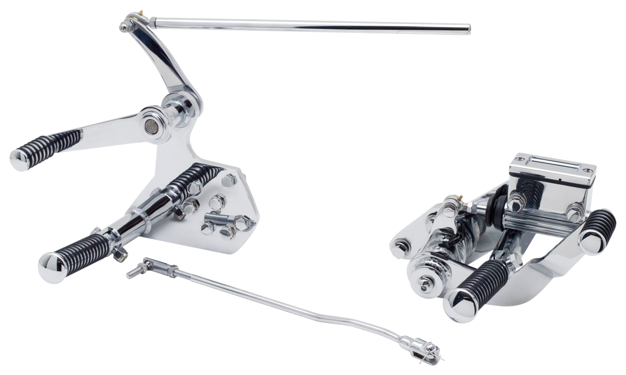 Complete forward control kits with 3/4" bore Kelsey-Hayes type master cylinder and all mounting hardware. The brake pedal and shift lever ride on bronze bushings giving smoother pedal action. Available as a complete kit with O-ring type foot pegs and shifter peg or as a kit without pegs. The kits without pegs allow you to pick the pegs of your choice or to get them matching with your passenger pegs. The foot peg supports have female clevises that will accept most male type foot peg. Shift levers accept any style shift peg. Rear brake line not included.