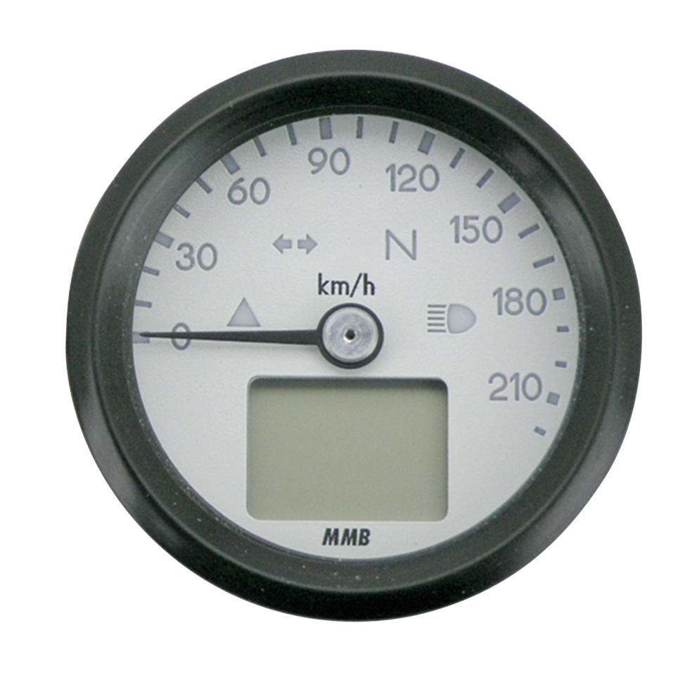 The MMB ELT60 Basic is a traditional design speedometer. Available with 220 km/h and 120 mph scales that feature a digital trip and total odometer. The two-layer display is able to show date, time, battery and fuel information. There are four control lights on the scale for neutral, high beam, warning and turn signal. Speedo works with the separately available Hall-effect sensor, as well as with the stock Harley speed sensor on 1995-2003 models. Installation on 2002 to present V-Rod, 2004-2013 Sportster, 2004-2010 Softail, 2004-2011 Dyna and 2004-2013 Touring requires the separate purchase of ZPN 744267 Break-Out box for the J-1850 Databus. Not suitable for later models with the CAN-Bus (HD-Link) system.The speedometer has a mounting dept of 46mm and a diameter of 60mm.