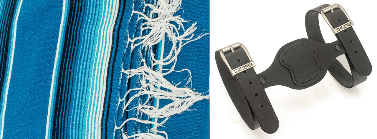 Authentic Made in Mexico sarapes, serapes, saltillos or Mexican blankets. Cozumel style blankets are made of an Acrylic with cotton and polyester blend, measuring 59"x84" (150x213cm). Veracruz style blankets are 100% Acrylic and measure 52"x80" (132x203cm). Available with or without Genuine Leather blanket holder that you can tie to your handlebars, sissy bar or you name it. Blanket holders have straps with 22" (56cm) useable length and can also be used for sleeping bags.