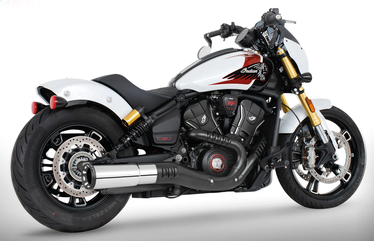 Fits all Indian Scout 2025 to present, chrome with black sculpted end cap, Slip-on muffler with Straight end cap