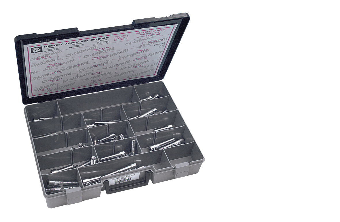 Assortment tray of grade 8 Chrome Allen head screws in 7/16" & 1/2" UNF. Tray contains 14 sizes, 70 pieces. Each size can be ordered in individual 5 packs.